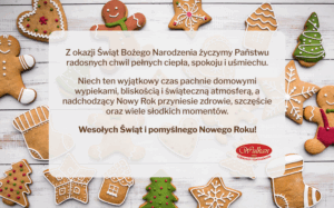 Z okazji Świąt Bożego Narodzenia składamy Państwu najserdeczniejsze życzenia radosnych chwil pełnych ciepła, spokoju i świątecznej atmosfery. Niech ten wyjątkowy czas będzie momentem wytchnienia, bliskości i uśmiechu, a dom wypełni się zapachem świątecznych wypieków oraz słodkich wspomnień.